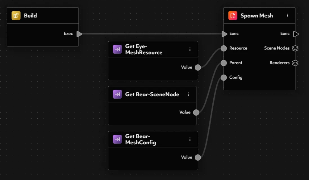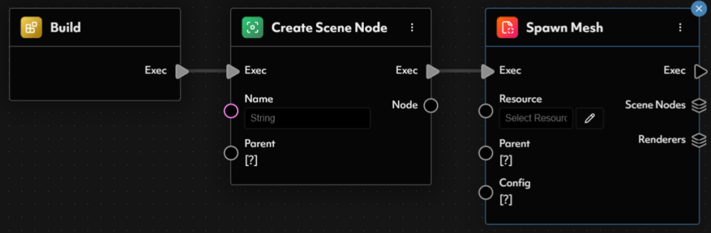 These nodes might include functions like “SpawnModel”, “ApplyMaterial” or “CreateSceneNode”.
